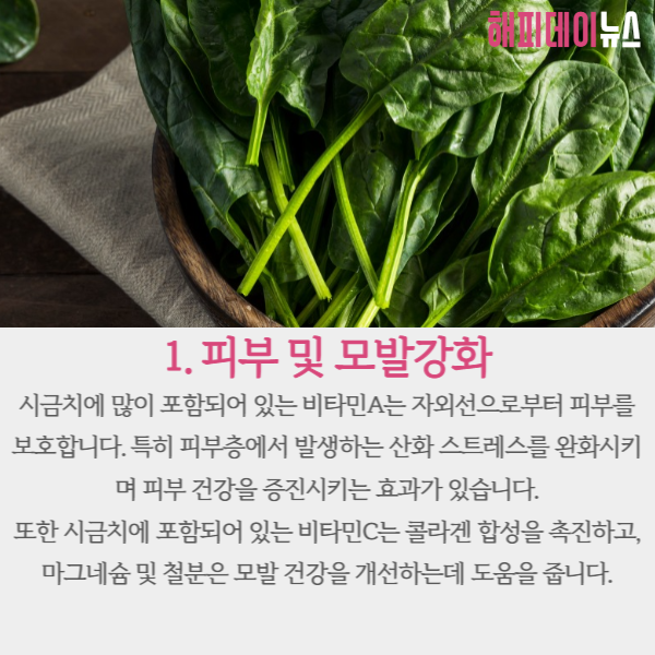또한 시금치에 포함되어 있는 비타민C는 콜라겐 합성을 촉진하고 그 외 마그네슘과 철분은 모발을 건강하게 만드는데 도움을 줍니다.