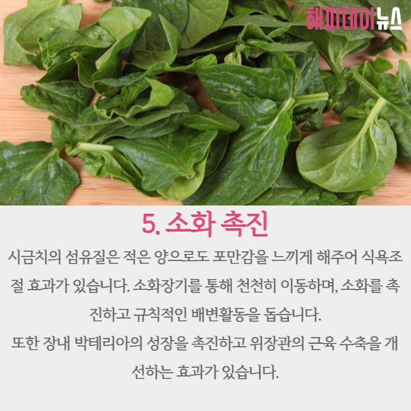 이 섬유질 덕분에 시금치는 소화장기를 통해 천천히 이동하며, 소화를 촉진하고 규칙적인 배변활동을 돕게 됩니다.