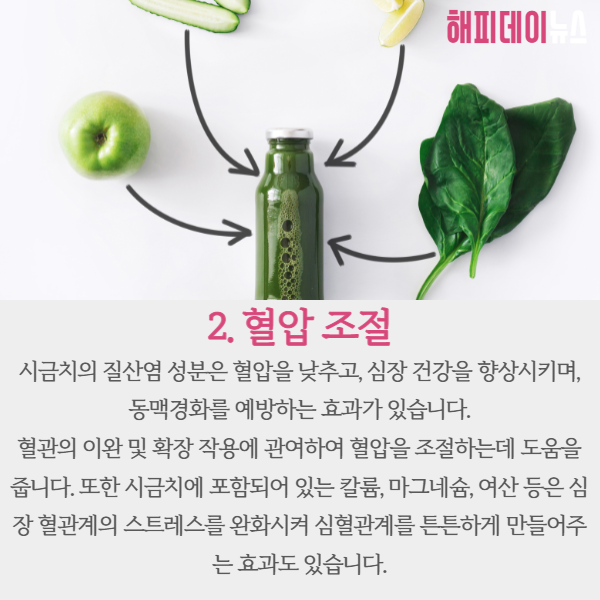 시금치에 풍부하게 포함되어 있는 질산염 성분은 혈압을 낮추고 심장 건강을 향상시키는 효과가 있습니다.