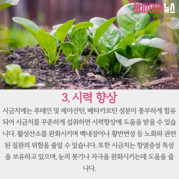 시금치에는 루테인 및 제아잔틴, 바테카로틴 성분이 풍부하게 함유되어 있어 시금치를 꾸준히 먹으면 시력향상에 도움이 됩니다.