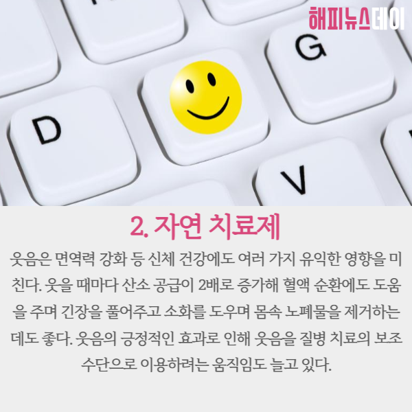 웃을 때마다 산소 공급이 2배로 증가해 혈액 순환에도 도움을 주며 긴장을 풀어주고 소화를 도우며, 몸속 노폐물을 제거하는데 효과적입니다.