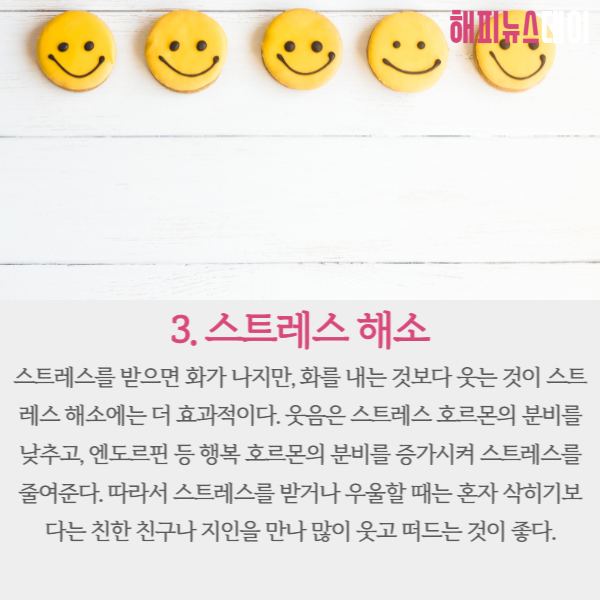 웃음은 스트레스 호로몬의 분비를 낮추고 엔도르핀 등 행복 호르몬의 분비를 증가시켜 스트레스를 줄여줍니다.
