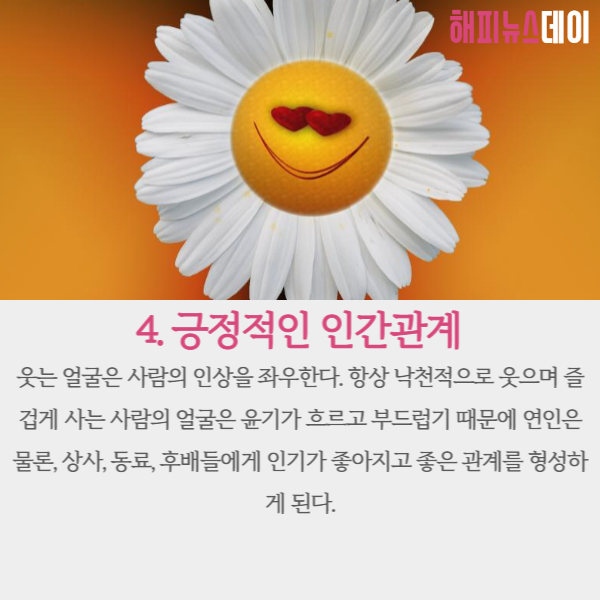 항상 낙천적으로 웃으며 즐겁게 사는 사람의 얼굴은 윤기가 흐르고 인상이 부드럽기 때문에 연인은 물론 상사, 동료, 후배들에게 인기가 좋아지고 좋은 관계를 형성하게 됩니다.