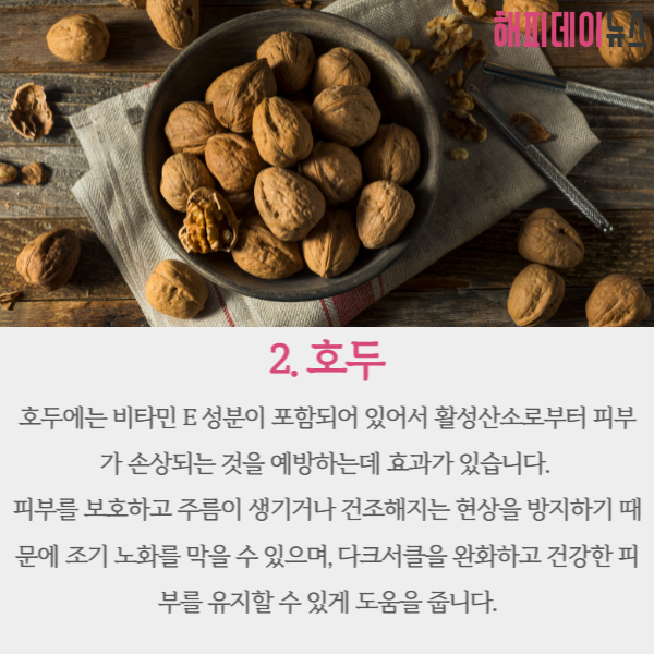 호두에는 비타민 E성분이 포함되어 있어 활성산소로부터 피부가 손상되는 것을 예방하는데 효과가 있다고 전해집니다.