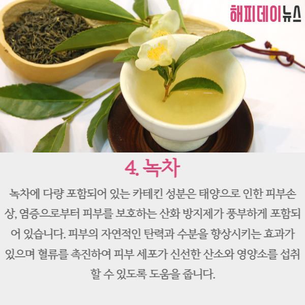 녹차에는 카테킨 성분이 다량 함유되어 있는데 이 성분은 태양으로 인한 피부손상 및 염증으로부터 피부를 보호하는 산화방지제 역활을 합니다.
