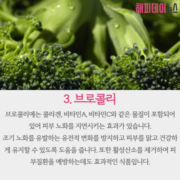브로콜리에는 콜라겐, 비타민A, 비타민C와 같은 물질이 포함되어 있어 피부 노화를 지연시키는 효과가 있습니다.