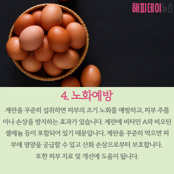 계란을 꾸준히 섭취하면 피부의 조기 노화를 예방하고 피부 주름이나 손상을 방지하는 효과가 있습니다.