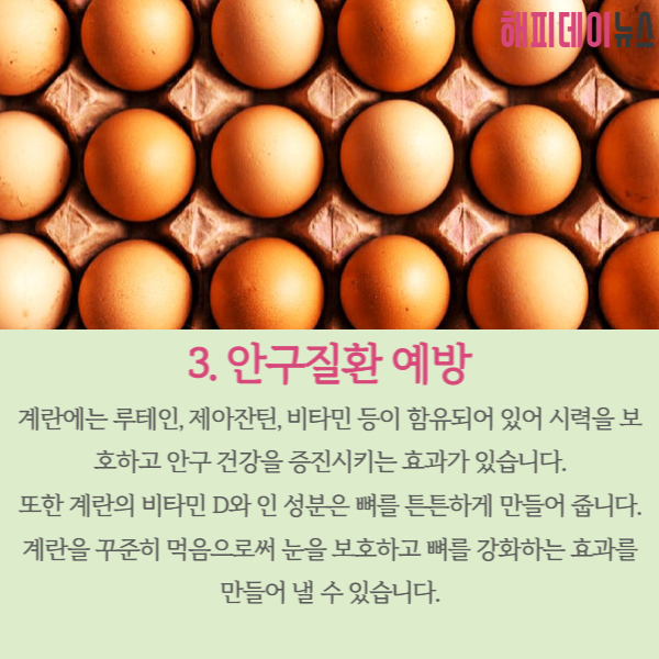 계란에는 루테인과 제아잔틴 등이 풍부하게 함유되어 있어 시력을 보호하고 안구 건강을 증진시키는 효과가 있습니다.