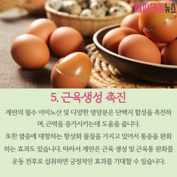 계란을 꾸준히 섭취하면 근육 생성 및 근육통 완화 등 긍정적인 효과를 기대할 수 있습니다.