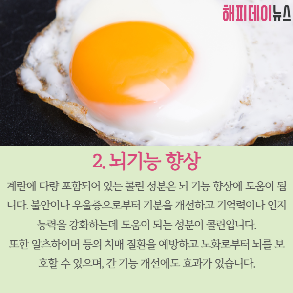 계란에 풍부하게 함유되어 있는 콜린 성분은 뇌 기능 향상에 도움이 되는 물질입니다.