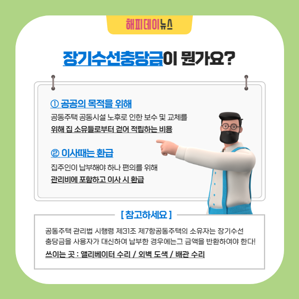 장기수선충당금은 공동주택 공동시설 노후로 인한 보수 및 교체를 위해 집 소유자들로부터 걷어 적립하는 비용입니다.