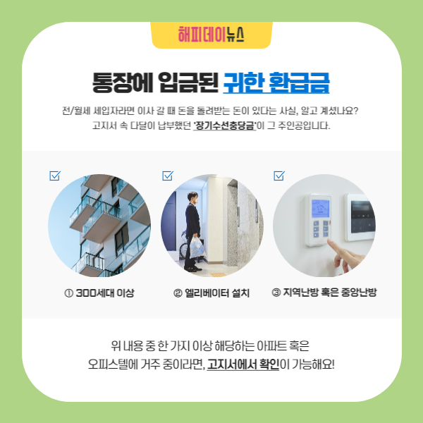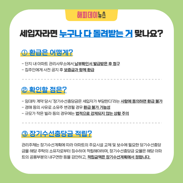 전세 및 월세 세입자라면 이사갈 때 아파트 장기수선충당금을 임대인으로부터 돌려받을 수 있습니다.